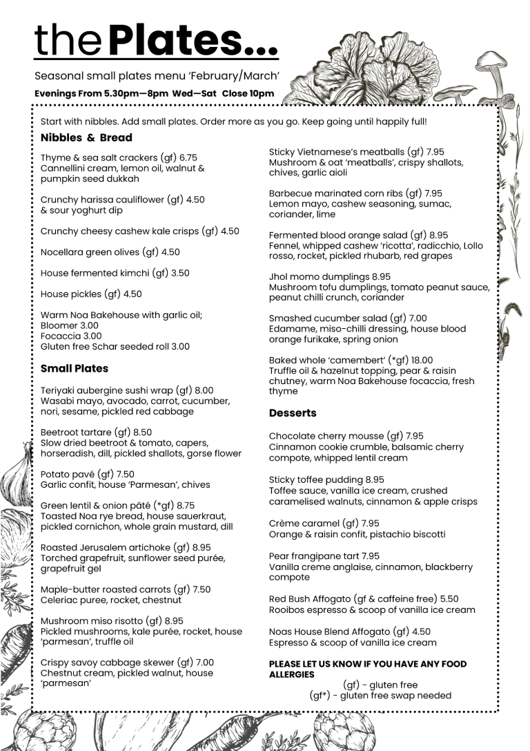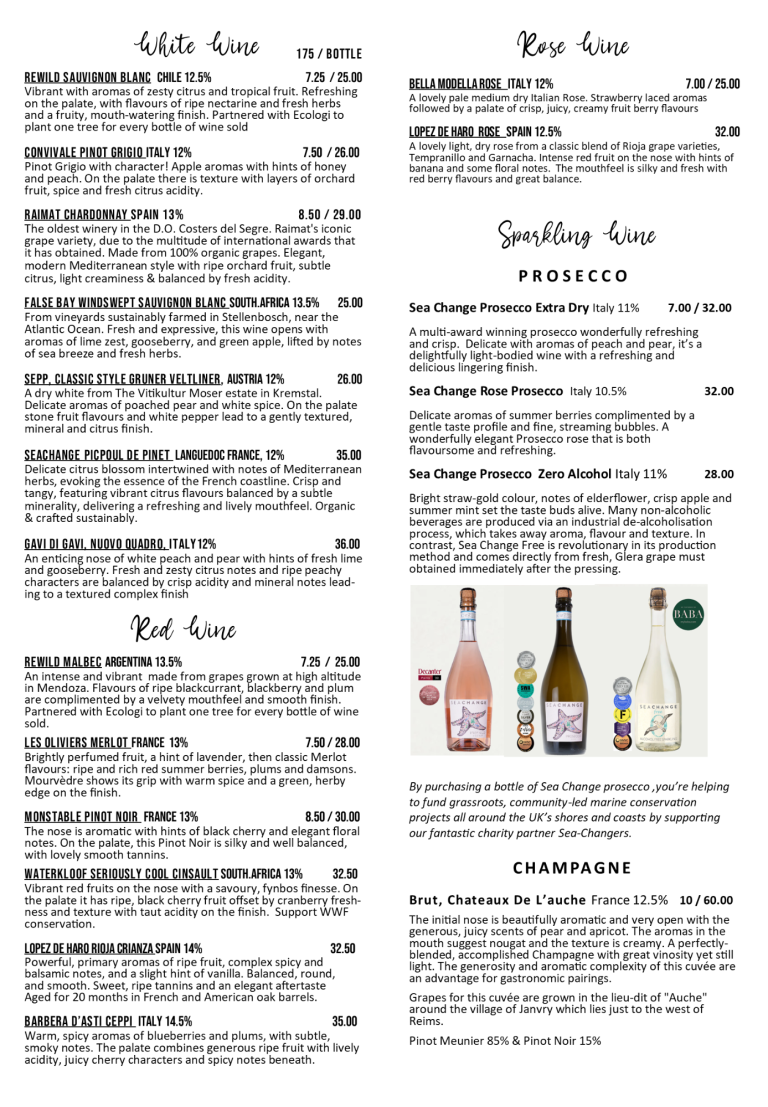 Drinks menu includes wine to pair with your food, artisan beer & cider, a large selection of botanical soft drinks and a fantastic selection of hot drinks.