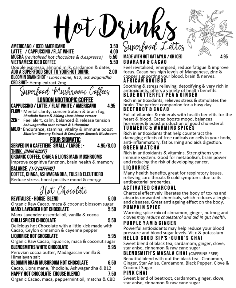 Dreamy hot drinks including superfood lattes, hot chocolates, barista coffee, and nootropic & adaptagenic coffees.